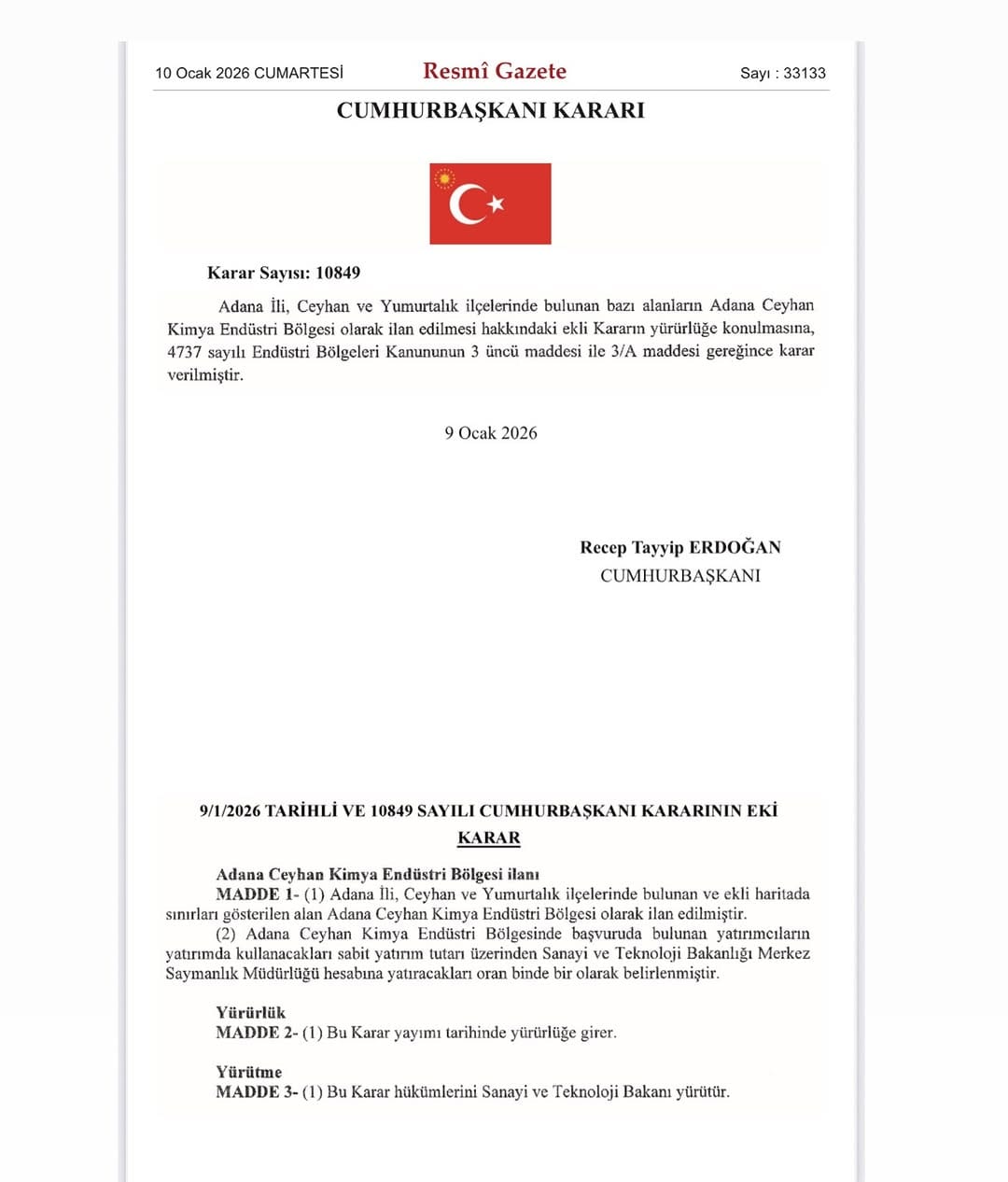 Adana ve çevre ilçelerin kalkınmasında dönüm noktası olacak tarihi bir karar, bugün tarihli Resmi Gazete’de yayımlanarak yürürlüğe girdi. Cumhurbaşkanı Recep Tayyip Erdoğan’ın imzasıyla yayımlanan 10849 sayılı karar uyarınca, Ceyhan ve Yumurtalık ilçeleri sınırları içerisinde bulunan geniş bir alan "Adana Ceyhan Kimya Endüstri Bölgesi" olarak ilan edildi.