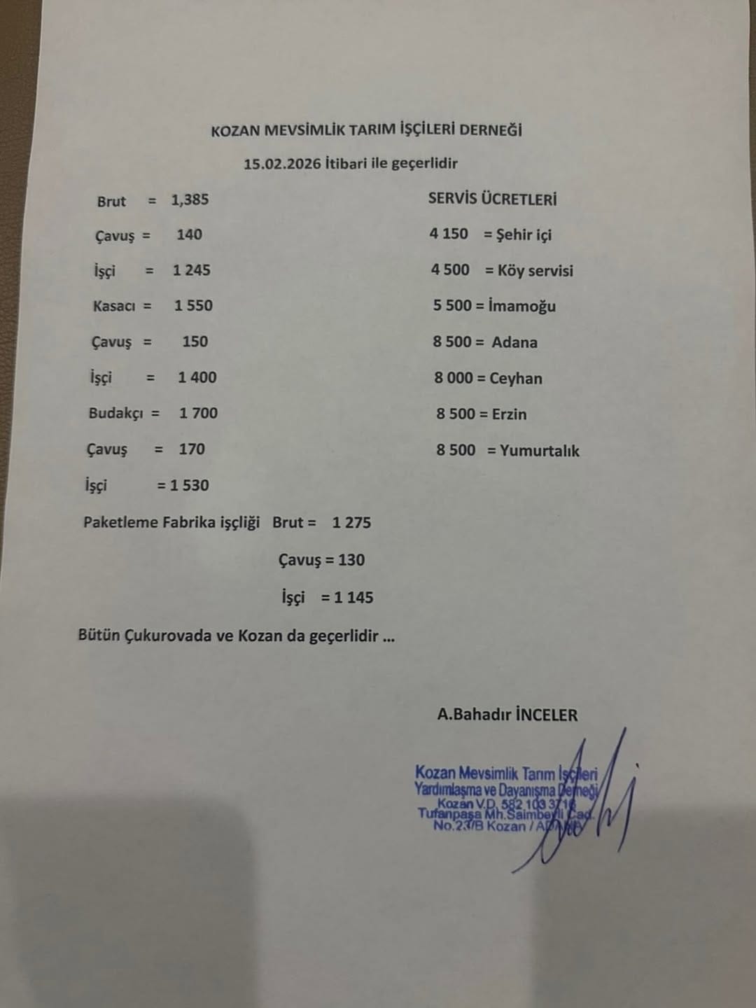 Kozan Mevsimlik Tarım İşçileri Derneği, 15 Şubat itibarıyla geçerli yeni yevmiye ve servis fiyatlarını açıkladı. Çukurova genelinde uygulanacak güncel rakamlar haberimizde.